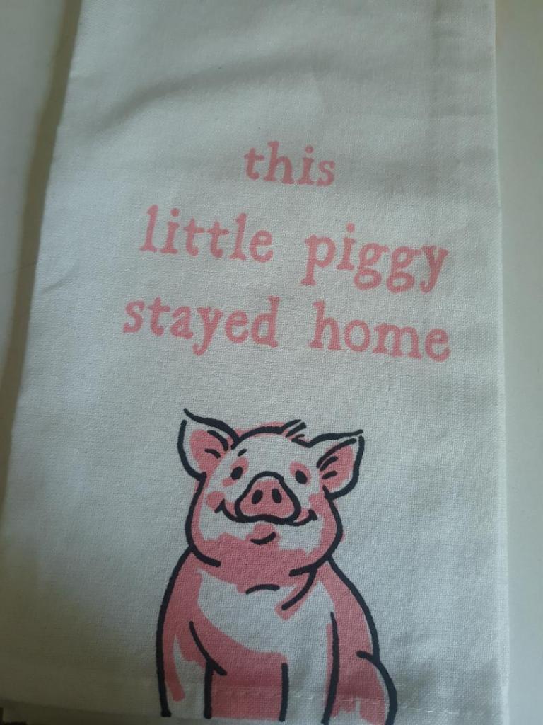 Picture Image: My sweet friend Laurie, dropped off this dish towel she found at Hobby Lobby yesterday. She said she saw it and automatically thought of me. I laughed so hard when I opened it. Because this little piggy, did stay home…since March 12th to be exact.