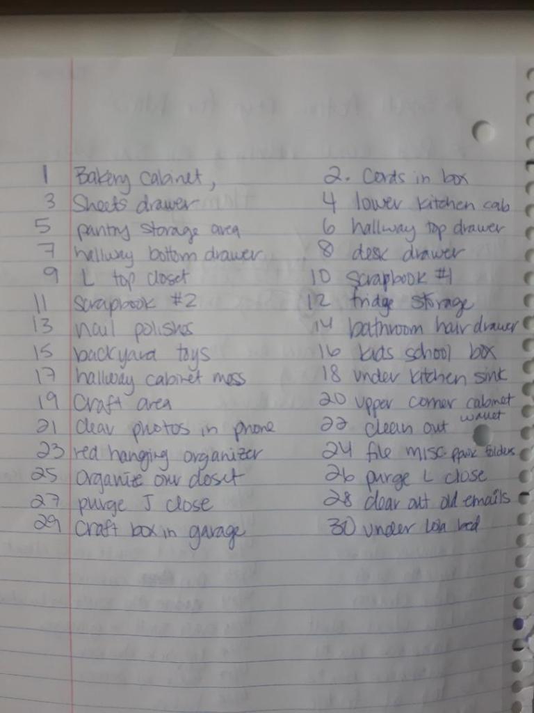 IMAGE: A picture of my list of 30 De-Cluttering goals.