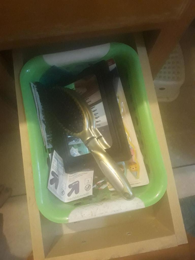 I gathered all the hair stuff (bobby pins, hair ties) and put them in a pink zippered bag I had laying around. I gathered all the “fancy” hair stuff (barrettes, sparkly bobby pins) and put it in a black zippered pouch. I threw out a bunch of combs and bobby pins that were past their prime and kept everything else in the basket that we have in the drawer to keep it organized – term used very loosely since we obviously haven’t been.